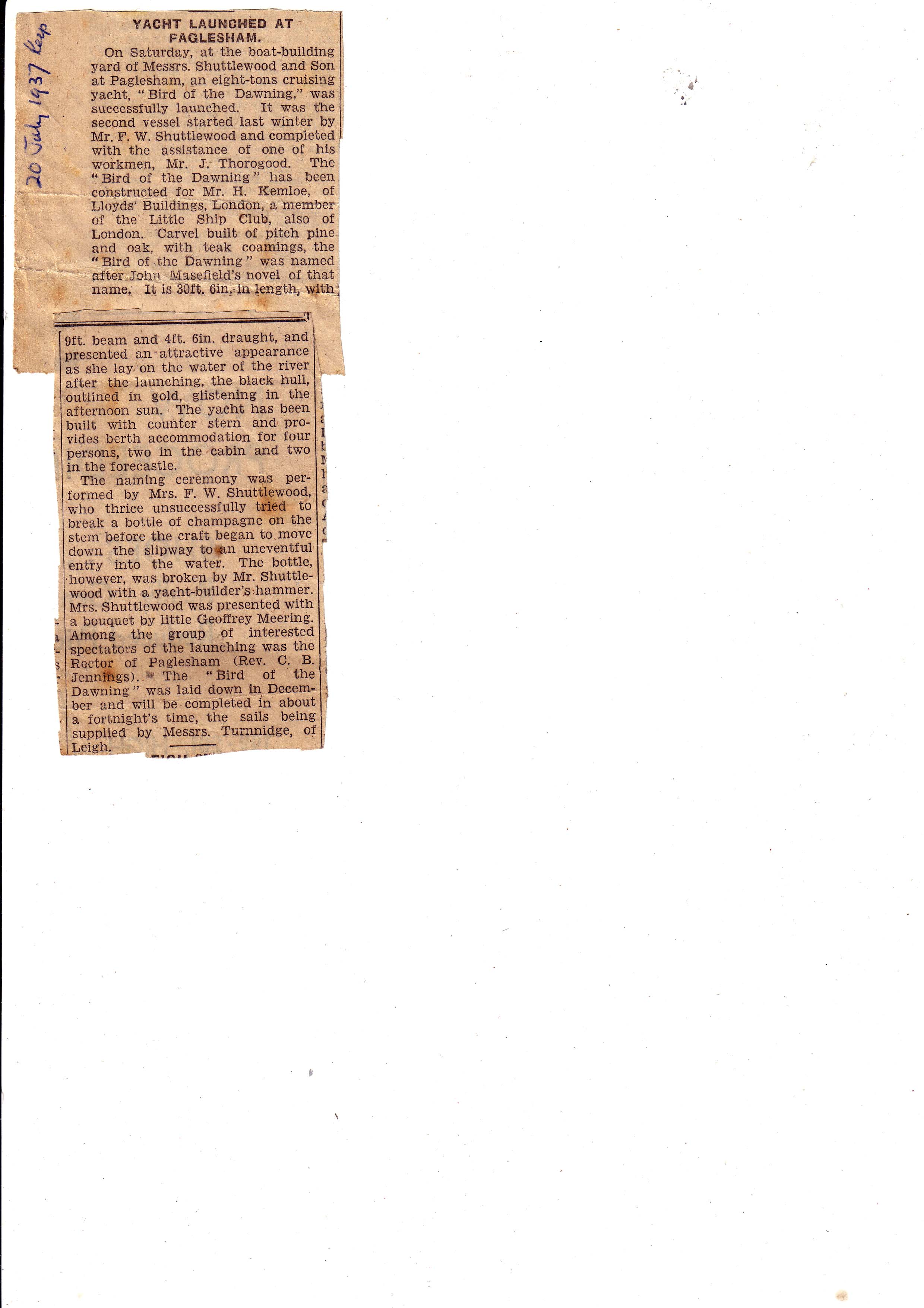 | No 286: Newspaper cutting of launch (Southend Standard, July 1937) (1937) [Source: Barbera Quillam.] |