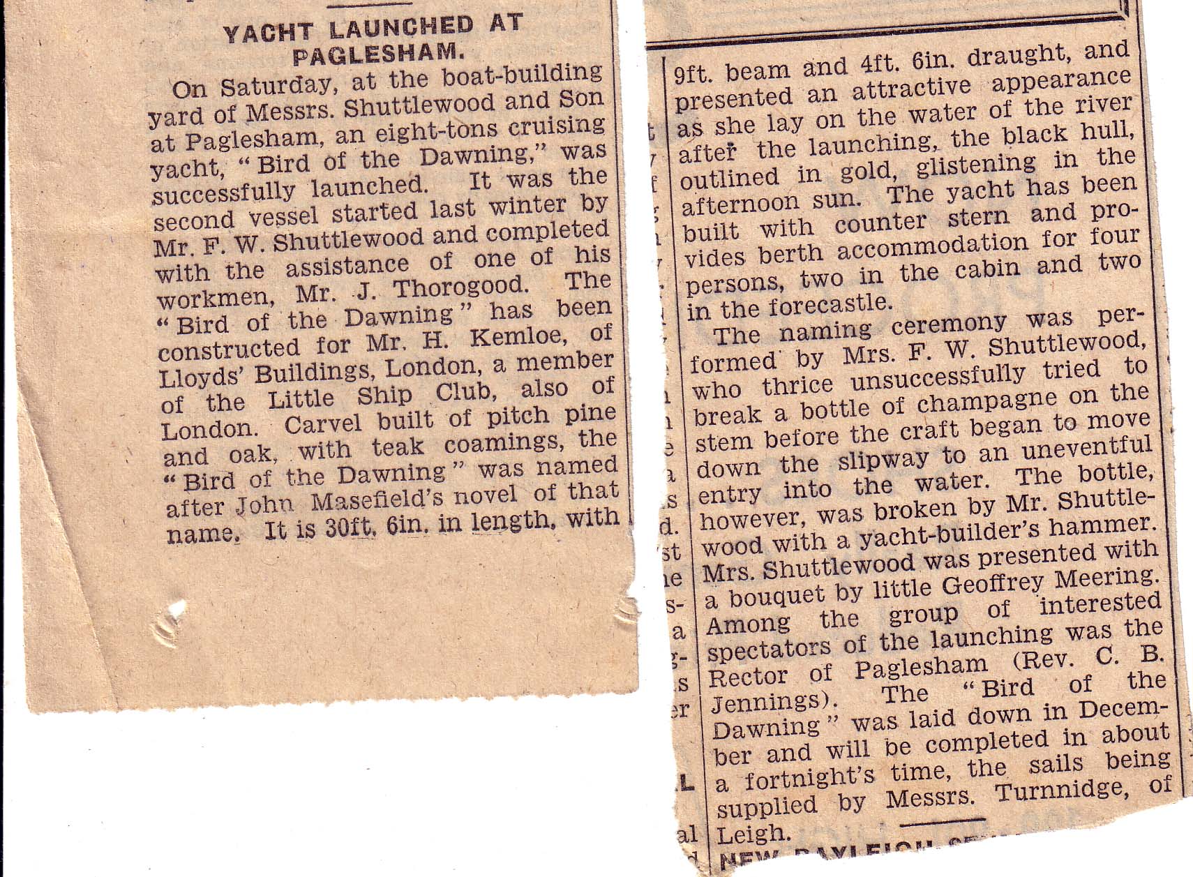 | No 293: Newspaper cutting of launch (1932) [Source: Barbera Quillam.] |