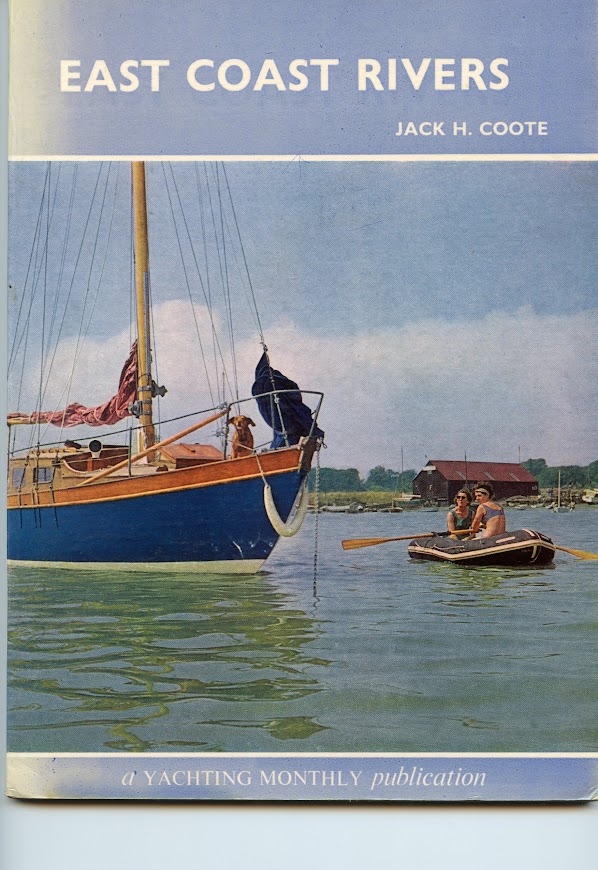 No 572: Front cover of East Coast Rivers 1967 edition. Jack Coote's Blue Shoal at Paglesham. Jan and mum Ellen in the black Avon, ship's dog Kim on the foredeck. (1967) [Source: Janet Harber.]