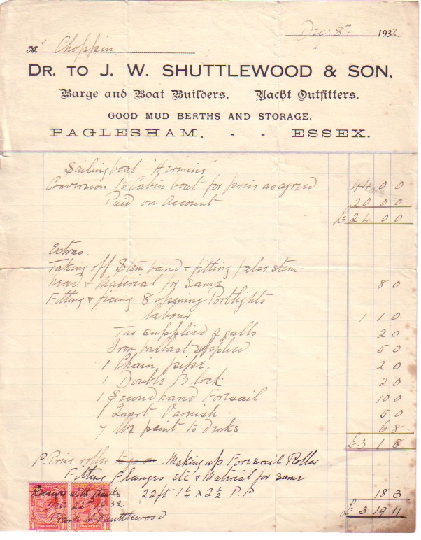| No 325: Bill for conversion to cabin boat - JW Shuttlewood (1936) [Source: Rodney Choppin.] |
