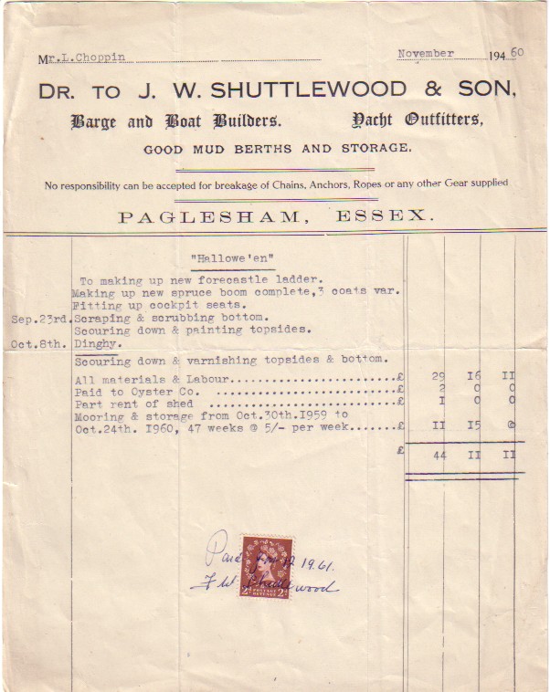 | No 326: Bill for repairs & mooring - JW Shuttlewood (1960) [Source: Rodney Choppin.] |