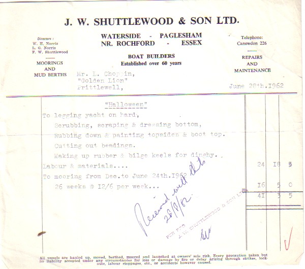 | No 327: Bill for repairs & mooring - JW Shuttlewood (1962) [Source: Rodney Choppin.] |