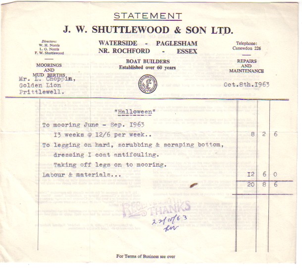 | No 328: Bill for repairs & mooring - JW Shuttlewood (1963) [Source: Rodney Choppin.] |
