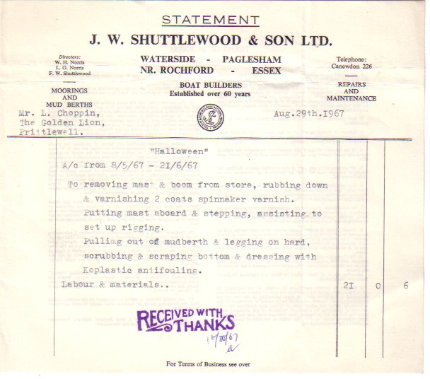| No 330: Bill for repairs & mooring - JW Shuttlewood (1967) [Source: Rodney Choppin.] |