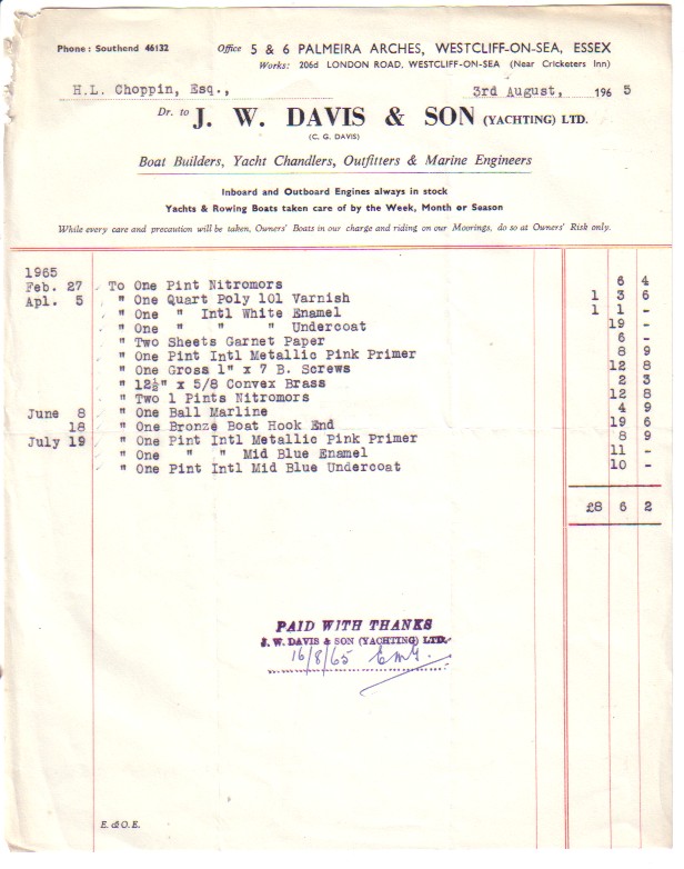 | No 331: Bill for chandlery - JW Davis, Westcliff (1965) [Source: Rodney Choppin.] |