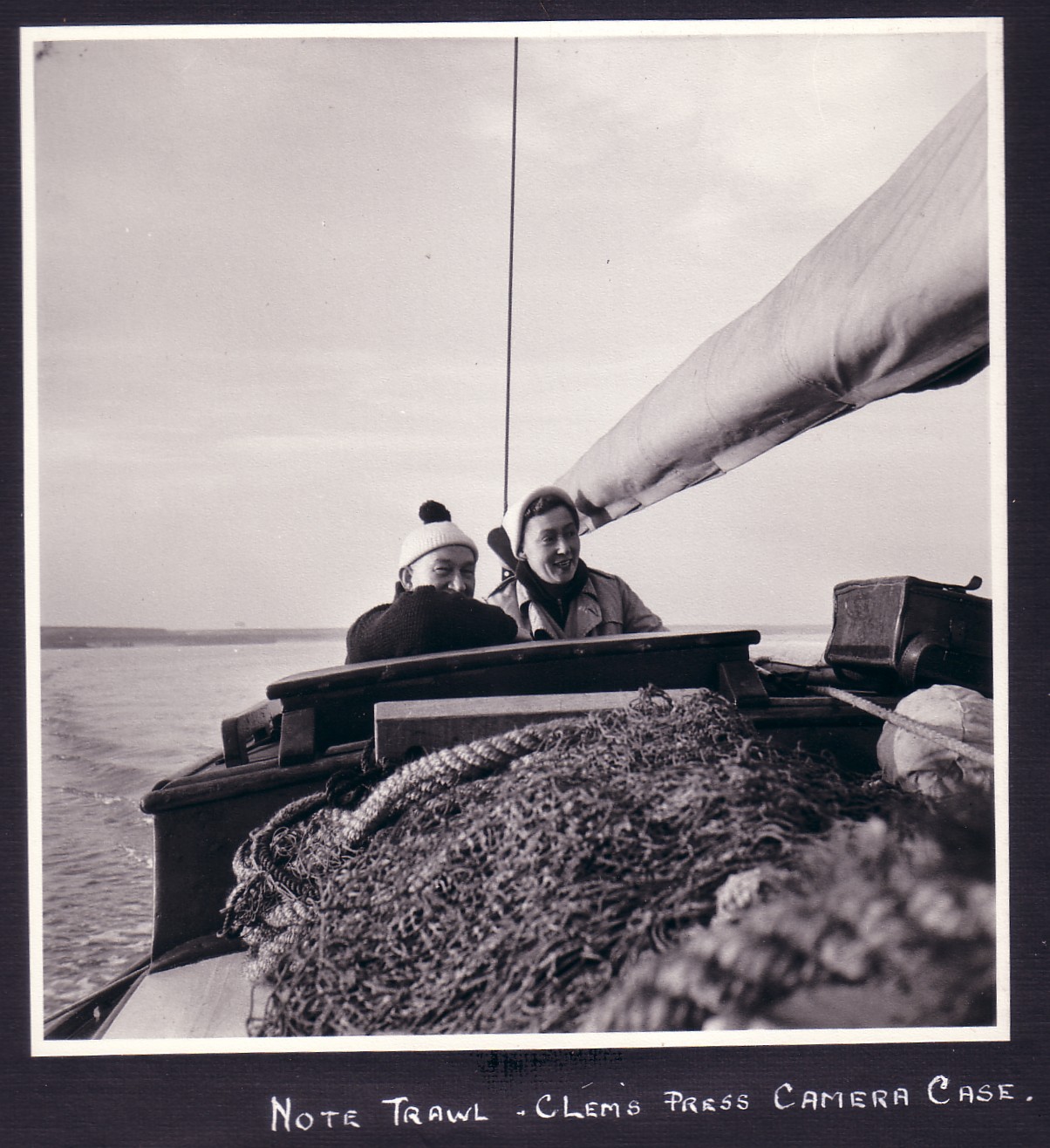 | No 354: Len and Peggy aboard, with trawl gear on cabin top. (1951) [Source: Photo by Clem Harris.] |