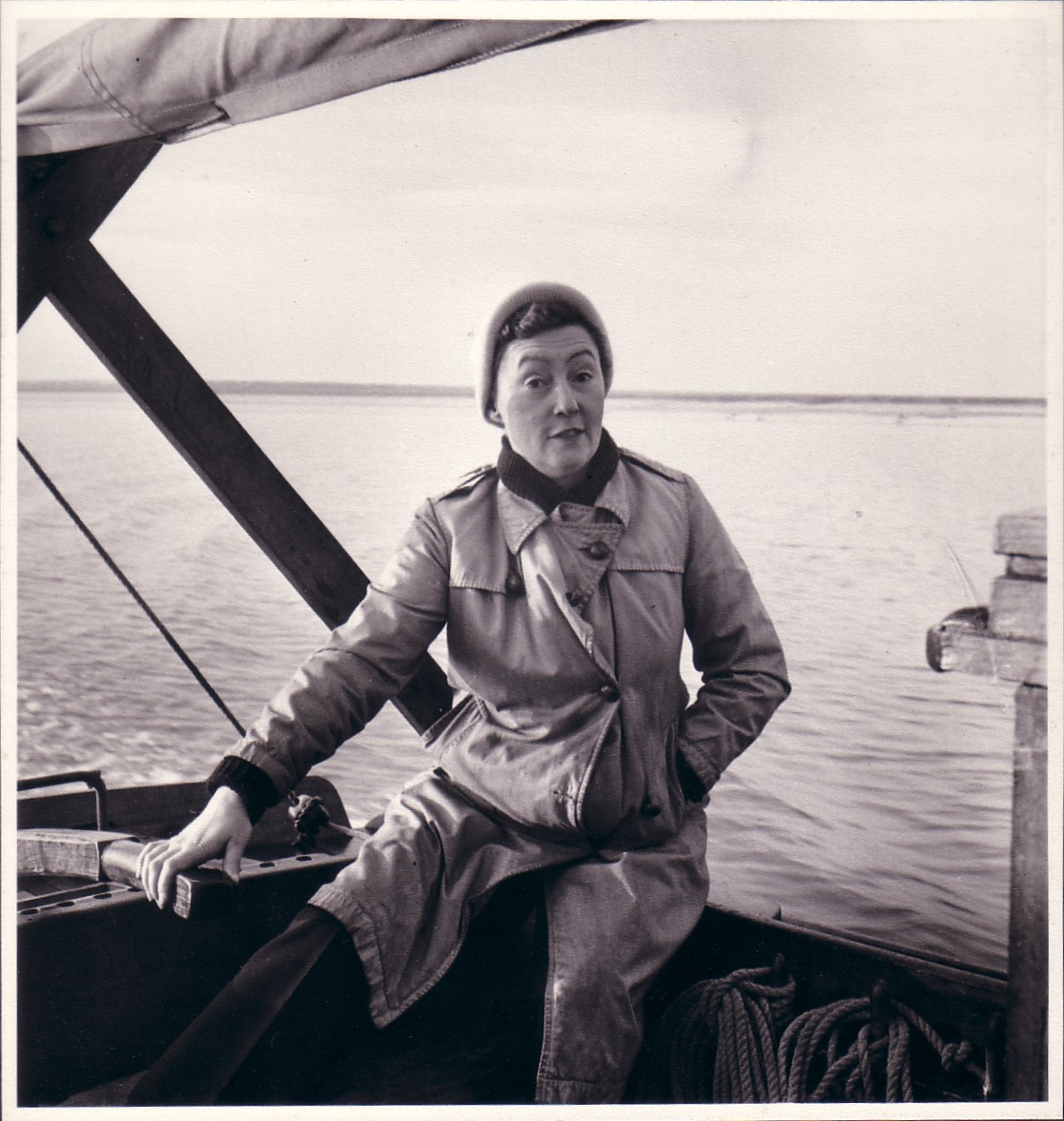 | No 355: Peggy Choppin at the helm. (1951) [Source: Photo by Clem Harris.] |