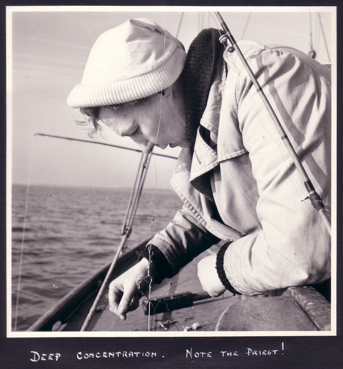 | No 356: Peggy fishing. The "Priest" was used to kill the fish (presumably so-called as it gave last rites!). (1951) [Source: Photo by Clem Harris.] |