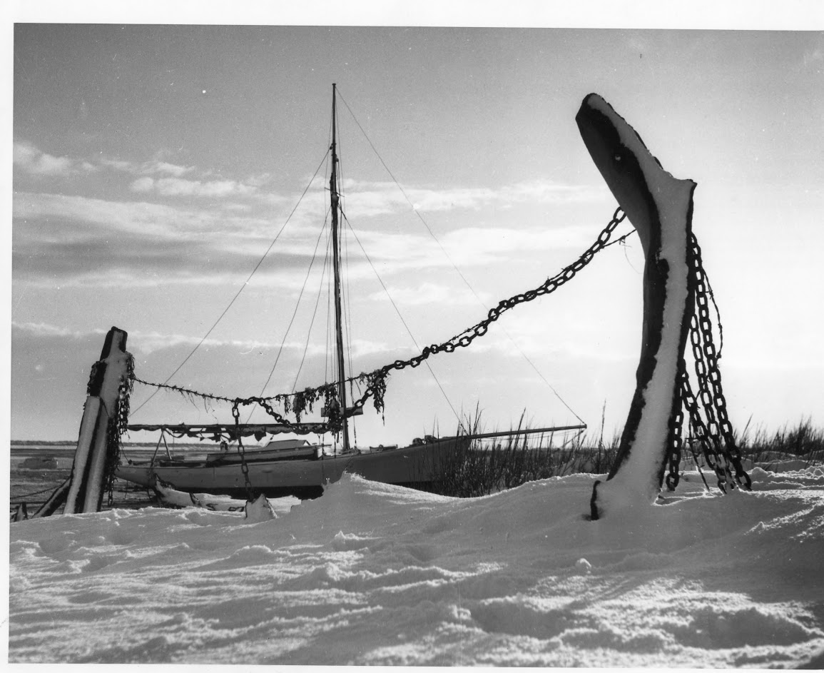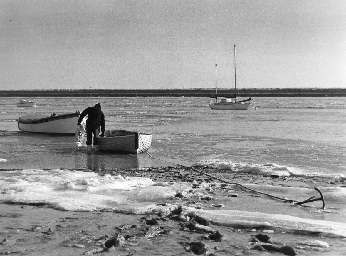 No 574: Ice on the Roach 1979. The Neptunian ketch on a mooring is one of many hulls finished by the Paglesham yard, which was owned at that time by the Norris family (1979) [Source: Janet Harber.]