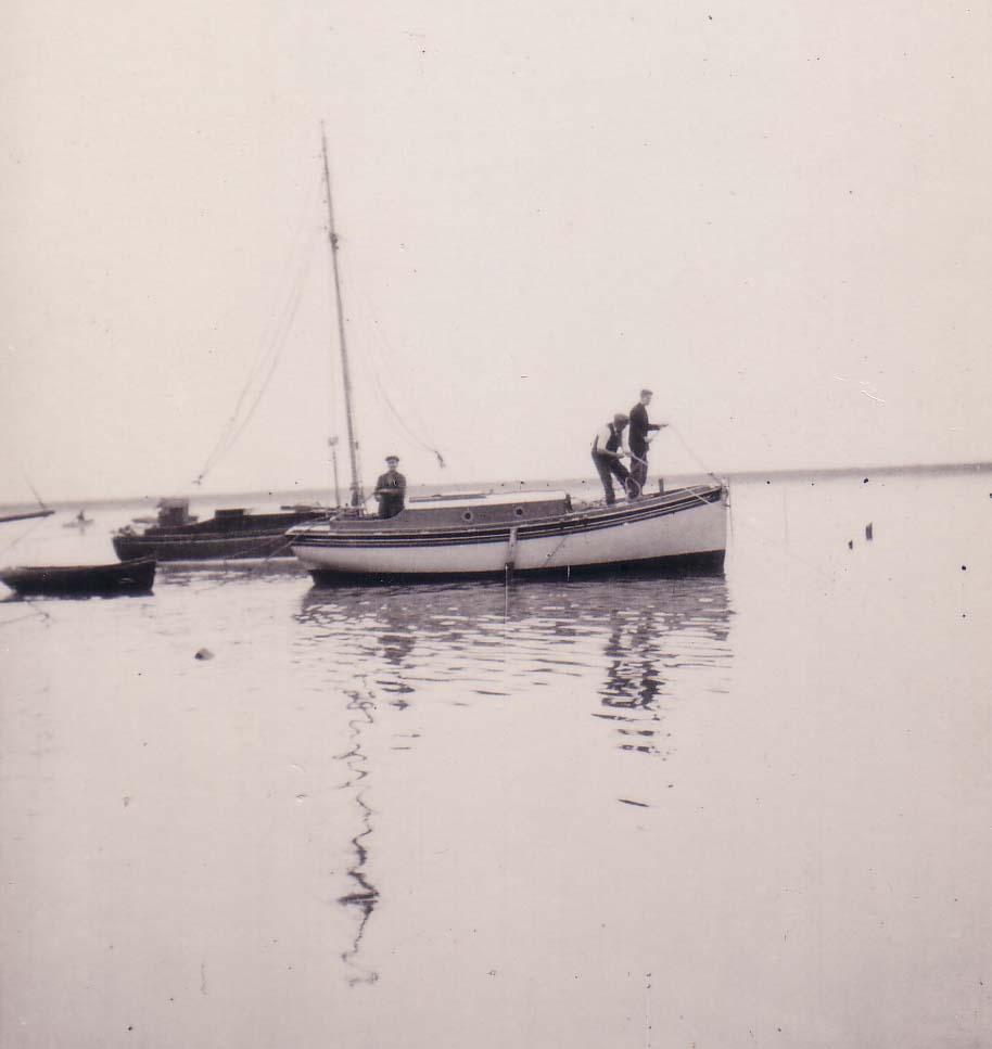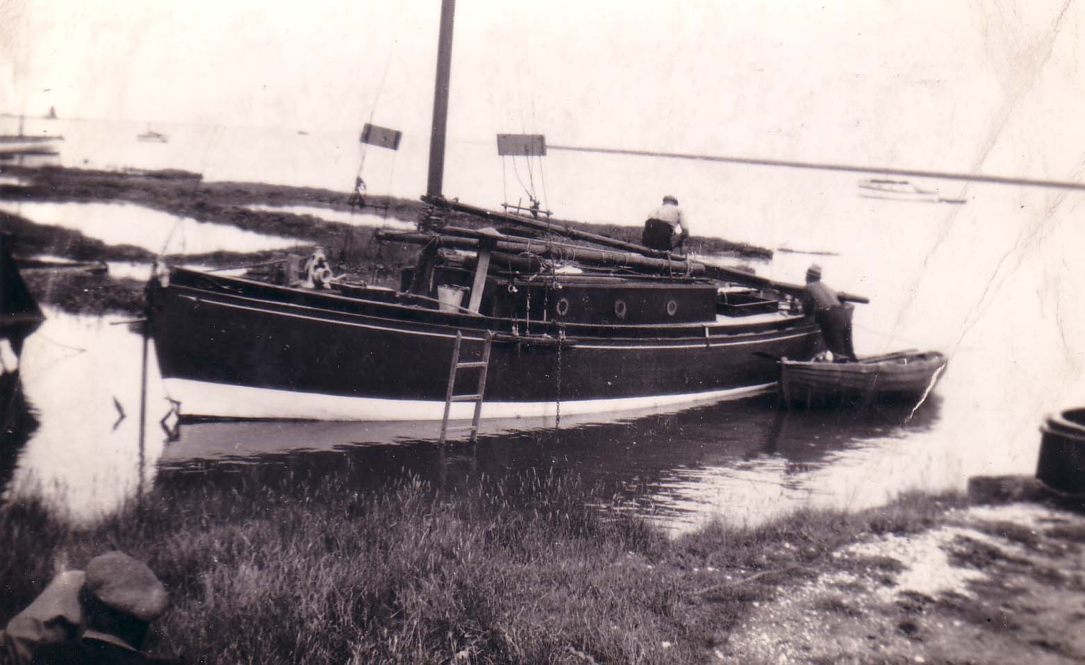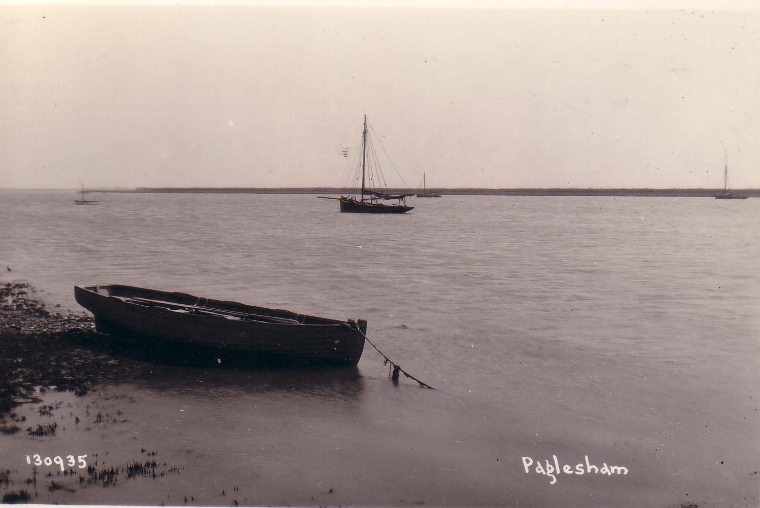 | No 135: Postcard 130935 - dinghy on saltings with smacks at anchor. [Source: Barbera Quillam.] |