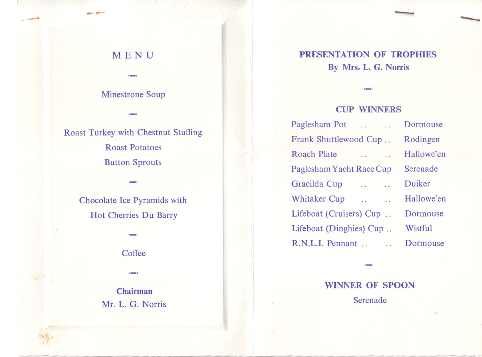 | No 404: Paglesham Laying Up Dinner card (1972) [Source: Rodney Choppin.] |