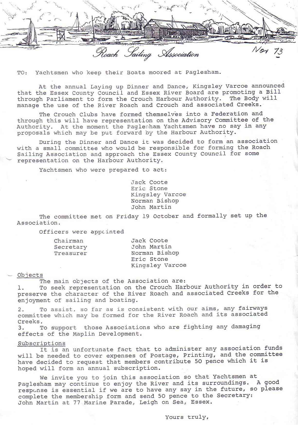 | No 758: Letter announcing formation of the Roach Sailing Association (1973) [Source: John Martin.] |