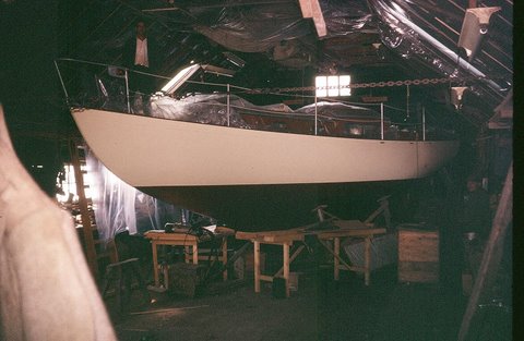 | No 393: Buchannan hull being fitted out in boatshed [Source: Anthony Elliot.] |