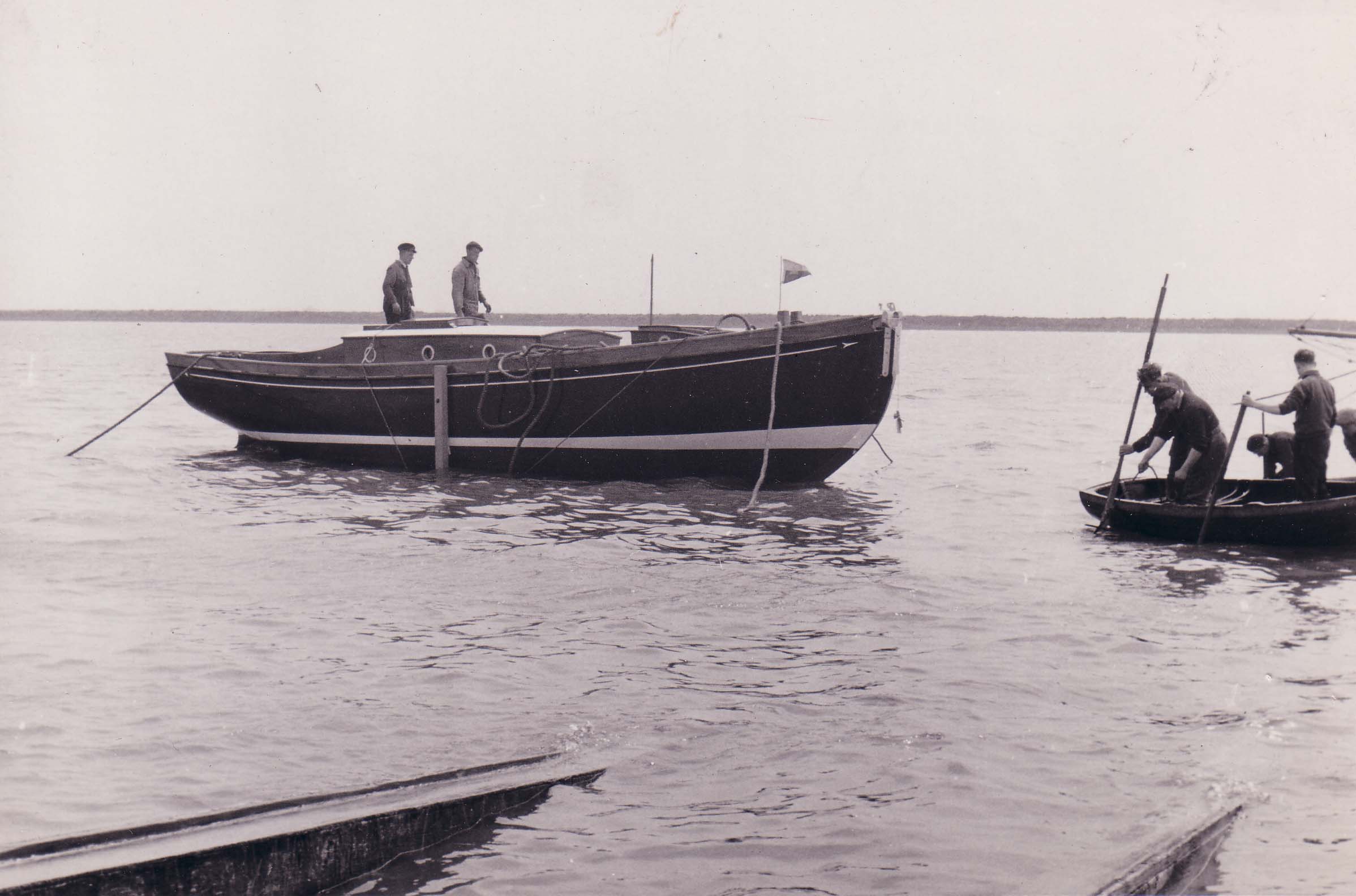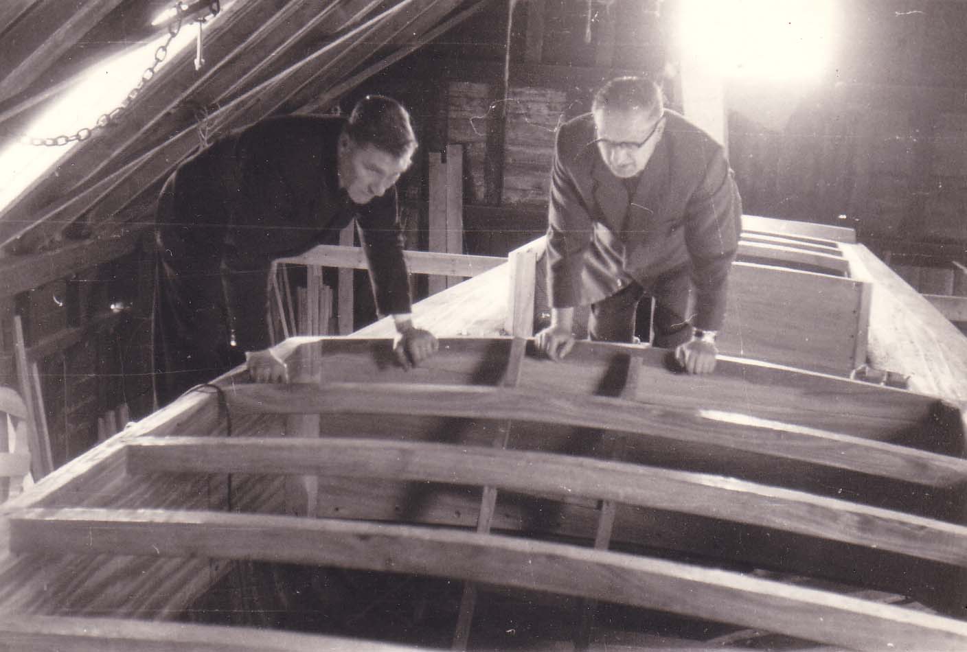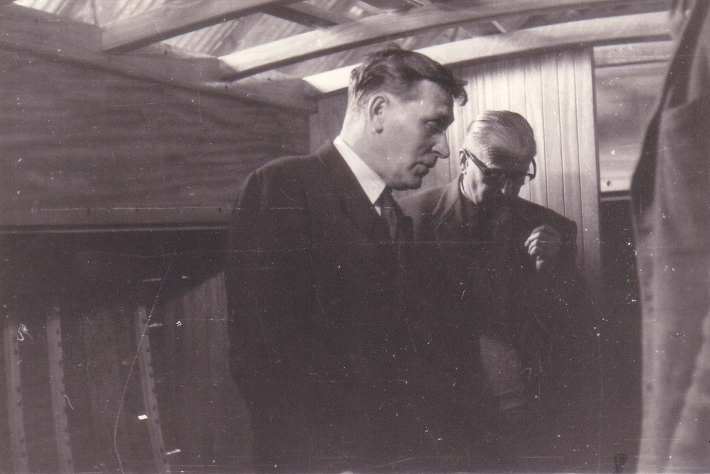 | No 159: Frank with client inspecting hull, about 1958 [Source: Barbera Quillam.] |